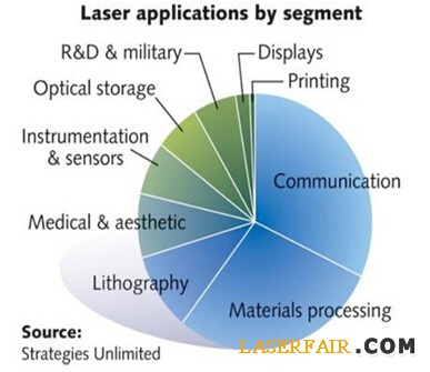 通信和光存儲仍然是激光產業(yè)最大的細分市場,然后是材料加工和光刻激光器市場部分。在2014年,醫(yī)療和美容激光產品銷售總額仍然大于儀器和傳感部分,最后是科研和軍事細分市場。