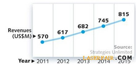 2014年,外科、眼科和美容激光銷售額分別增長13%、9%、8%,2014年醫(yī)用和美容激光器市場銷售額為7.45億美元,預計2015年增長9%超過8.15億美元。