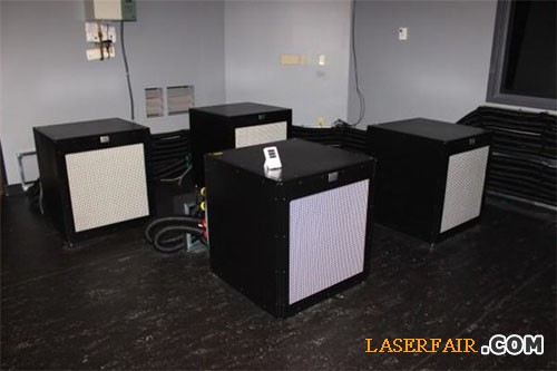 不過,這套4K激光IMAX投影系統(tǒng)也需要用到大功率的冷卻設(shè)備。圖中的這四個(gè)盒子和一套黑色的皮管便是它們最主要的冷卻工具。