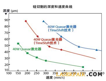 我們使用Quasar激光器對厚度小于100μm的拋光單晶硅片進行熱損傷最小的高速刻劃。在圖1中,曲線顯示,隨著劃刻速度的增加,劃刻深度會降低(200 kHz、25ns單脈沖)。在較高的重復(fù)頻率下使用較高的功率,同時TimeShift技術(shù)可以用軟件設(shè)置范圍廣泛的脈沖能量和脈沖寬度,最終我們可以看到,刻劃速度提高了差不多3倍(25ns單脈沖,50μm的刻劃深度)。