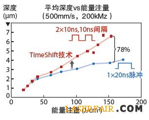 圖3:氧化鋁的刻劃深度vs能量注量曲線,顯示了TimeShift技術(shù)對生產(chǎn)率的影響。