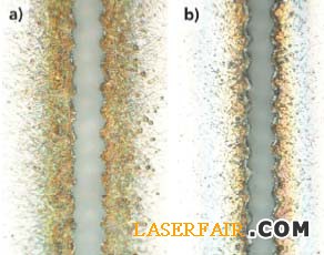 圖2:使用單脈沖TimeShift技術(shù)進行刻劃的效果,圖(a)中的刻劃深度為20μm,圖(b)中的刻劃深度為25μm。