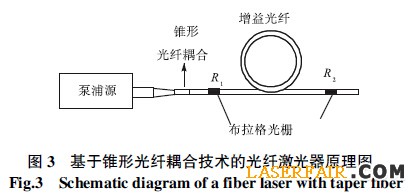 端面耦合技術(shù)將泵浦光聚焦到雙包層光纖內(nèi)包層端面處,直接耦合到雙包層光纖中,這種技術(shù)最大的特點在于結(jié)構(gòu)簡單,易于實現(xiàn),因此端泵浦技術(shù)在包層泵浦技術(shù)發(fā)展的初期被處于科技前沿的國內(nèi)外研究者廣泛采用。根據(jù)泵浦光和接受雙包層光纖兩者的數(shù)值孔徑和光斑大小,設(shè)計合適的透鏡組將泵浦光耦合進(jìn)雙包層光纖,在泵浦光功率較高時,這種方法因受光面積所限,光纖端面處的光密度極高,故易造成光纖端面損傷;另一大缺陷在于,相對于耦合光斑來說,光纖端面接受面積太小,以至于稍微的位置偏移都會引起耦合效率的急遽下降。于是全光纖連接方案受到研究者的注意,錐形光纖耦合技術(shù)是最初考慮的途徑之一,如圖3 所示。