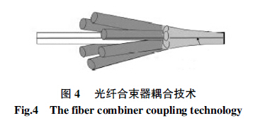 錐形光纖耦合方式是一種改進(jìn)的端泵浦耦合方式,主要依靠錐形光纖將尾纖輸出的大模場直徑光斑壓縮進(jìn)橫截面相對較小的雙包層光纖中。這種方式耦合效率高于普通的端泵耦合方式,只是不能實現(xiàn)環(huán)形激光腔結(jié)構(gòu)及激光放大器,且不適用于多個高能激光泵源的同時泵浦。為了實現(xiàn)多個泵浦源的同時泵浦,研究者對錐形光纖耦合技術(shù)稍作改進(jìn),發(fā)展了光纖合束器耦合技術(shù)。如圖4 所示,這種耦合技術(shù)將多根多模光纖組成的光纖束逐漸收縮為單根與雙包層光纖尺寸相匹配的多模光纖,再與雙包層光纖連接。該技術(shù)適用于多個帶尾纖的大功率LD 同時泵浦。它可以將光纖束中心的一根多模光纖替換為適于信號光傳輸?shù)膯文9饫w與雙包層光纖纖芯熔接,這樣泵光可以從多模光纖耦合到摻雜光纖內(nèi)包層中,而信號光可以從中心的單模光纖耦合到纖芯中,從而解決了錐形光纖無法實現(xiàn)環(huán)形腔結(jié)構(gòu)設(shè)計的弊端,并且使得多路泵浦成為可能。