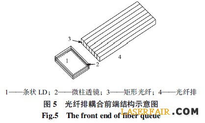 斜角光纖耦合技術(shù)和棱鏡耦合技術(shù)屬于同一種泵浦原理的耦合技術(shù),但就工藝難度相比而言,斜角光纖耦合技術(shù)最容易實現(xiàn)。根據(jù)有關(guān)理論分析,斜角光纖的耦合效率與端面斜角有關(guān),最大耦合效率時存在唯一一個最佳角度,該最大耦合效率值與光纖參數(shù)有關(guān)。另外,斜角光纖耦合技術(shù)對于非尾纖輸出的條狀半導(dǎo)體激光器泵浦光的耦合特別有效,將數(shù)根矩形光纖或玻璃絲排列成光纖排,前端面與條狀LD 輸出面通過微柱透鏡耦合(見圖5),后端的光纖或玻璃絲各自獨立,每根末端均磨成斜角,分別在雙包層光纖內(nèi)包層側(cè)面的不同位置耦合,適用于多點泵浦。