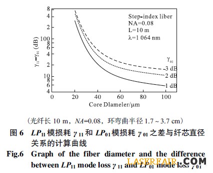 2000 年,Koplow 等人報道了一個多模雙包層光纖環(huán)獲得的單橫模激光輸出。他們采用的摻鐿雙包層光纖纖芯直徑為25μm,纖芯數(shù)值孔徑0.1,在波長1064nm 處的V 值為7.4。在光纖不繞環(huán)之前,激光器多模輸出;經(jīng)過光纖繞環(huán)后,除基模之外的其他模式損耗明顯增大,以LP11模為例,如圖6所示:纖芯直徑在50~100μm(V 值為12~24),光纖內(nèi)LP11模的彎曲損耗比基模LP01的彎曲損耗至少大幾個dB,特別是在基模LP01的彎曲損耗為3dB 時,兩者之差達(dá)到10dB 以上。最后激光器光束輸出質(zhì)量因子M2 達(dá)到1.09,研究結(jié)果證明光纖環(huán)的模式選擇作用非常有效。