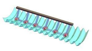 麻省理工學(xué)院的VladanVuletic和同事們把一排帶負(fù)電的鐿離子放在電場中,模擬出了一個“表面”,并用兩臺激光器發(fā)出的激光模擬出另一個“表面”,激光的干涉條紋對原子產(chǎn)生了周期性的力,就像金屬表面的褶皺一樣。研究人員讓這排離子沿著激光滑過,激光對離子產(chǎn)生了壓力可以模擬原子間作用力,在兩種“固體”間產(chǎn)生了摩擦。