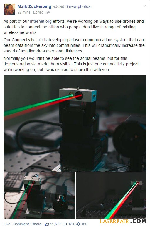 Facebook開發(fā)激光通信系統(tǒng) 據(jù)科技網(wǎng)站SiliconBeat報道,F(xiàn)acebook首席執(zhí)行官馬克扎克伯格(Mark Zuckerberg)當(dāng)?shù)貢r間周三宣布,該