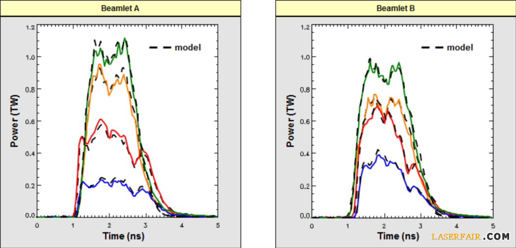 為設(shè)計(jì)建模的主要工具,ARC調(diào)試與操作是一個(gè)光線追跡代碼類似FRED和基于傅里葉衍射代碼像VBL和MIRó的組合,分別由LLNL與法國(guó)CEA開(kāi)發(fā)。建模之后,仿真結(jié)果和調(diào)試結(jié)果進(jìn)行了比較。對(duì)于這次調(diào)試中的激光發(fā)射,模型沒(méi)有為匹配短脈沖運(yùn)行而再優(yōu)化,預(yù)期輸出能量偏差為4%~5%而標(biāo)準(zhǔn)偏差為1%。在圖3的功率曲線比較表明模型正確預(yù)測(cè)了大口徑NIF放大器在時(shí)間頻譜域和空間域的光譜窄化和飽和。
