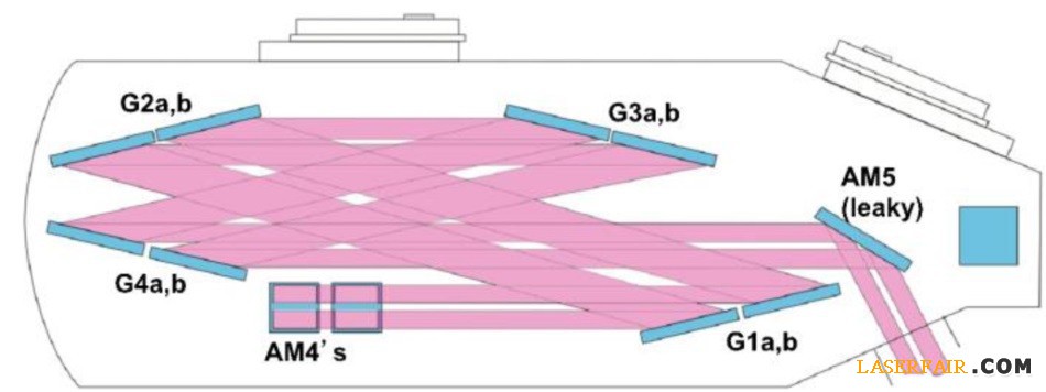 當(dāng)NIF系統(tǒng)正常打靶時(shí),千焦耳的ARC四簇激光束通過(guò)一系列大反射鏡的NIF轉(zhuǎn)換場(chǎng)注入靶室前端。當(dāng)ARC打靶時(shí),反射鏡滑入導(dǎo)引光束進(jìn)入兩個(gè)大型真空室中,真空室內(nèi)放置八個(gè)四光柵,折疊壓縮器,壓縮放大的啁啾脈沖到皮秒寬度。每格真空室內(nèi)包含兩層四組壓縮器。圖2顯示了其中一層的水平布局。