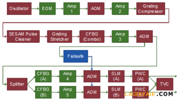NIF主激光器和大口徑放大器基本不變,當(dāng)一個(gè)2ns FWHM正啁啾展寬脈沖以半焦耳能量注入主激光放大器,在主激光輸出口產(chǎn)生3kJ能量,主激光器B積分小于1.8rad。該方案擁有最大的靈活性,靶室允許僅長(zhǎng)脈沖打靶,或僅ARC打靶,或188路長(zhǎng)脈沖與8束ARC子光束組合運(yùn)行。