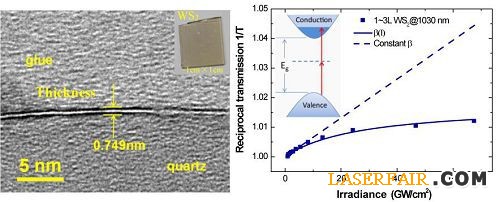 研究小組張賽鋒等人與愛爾蘭都柏林圣三一大學(xué)合作,觀測(cè)到1-3層WS2薄膜的近紅外簡(jiǎn)并雙光子吸收及其飽和效應(yīng),通過控制單層數(shù)量,實(shí)現(xiàn)了WS2和MoS2寡層薄膜非線性特性的調(diào)控工程,通過改變波長(zhǎng)調(diào)控寡層半導(dǎo)體中共振態(tài)和非共振態(tài)雙光子吸收以及飽和吸收的“開-關(guān)”操作,為禁帶寬帶大于光子能量的二維半導(dǎo)體的鎖模和調(diào)Q特性提出了一種物理機(jī)理。相關(guān)論文已被ACS Nano雜志(影響因子12.881)在線出版。