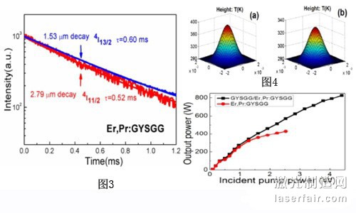 圖3. Er,Pr:GYSGG晶體上下能級熒光衰減曲線。圖4. 端面泵浦Er,Pr:GYSGGG和GYSGG/Er,Pr:GYSGG晶體溫度分布。圖5. 端面泵浦Er,Pr:GYSGG和GYSGG/Er,Pr:GYSGG激光輸出功率特性。