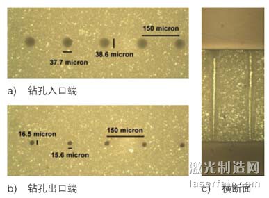 圖2 表示在厚度為381 μm的氧化鋁(99.6%)上以750 孔/s的速度鉆孔后孔的形態(tài)。經(jīng)測量,鉆孔入口端孔徑約37 μm,出口端約16 μm。該實(shí)驗(yàn)使用的是單模光纖。