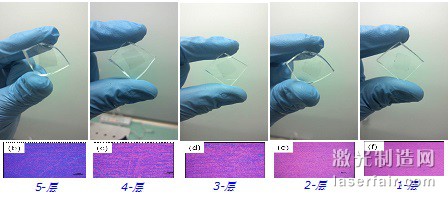 圖1 原始5層石墨烯經(jīng)超快激光減薄后得到的4層、3層、2層和1層石墨烯的照片和其對(duì)應(yīng)的光學(xué)顯微鏡顏色照片