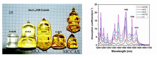 圖1. 生長制備的不同Sm3+摻雜量的SmxY1-xCOB晶體(左圖)及其對應1572nm附近的近紅外吸收光譜(右圖)