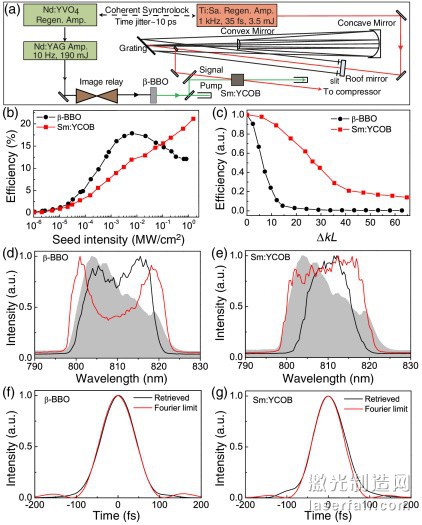 圖2. 激光實驗裝置原理圖及采用Sm:YCOB與BBO晶體分別實現(xiàn)QPA和OPA在轉換效率、相位失配容許、輸出光波形、壓縮脈寬等方面的對比