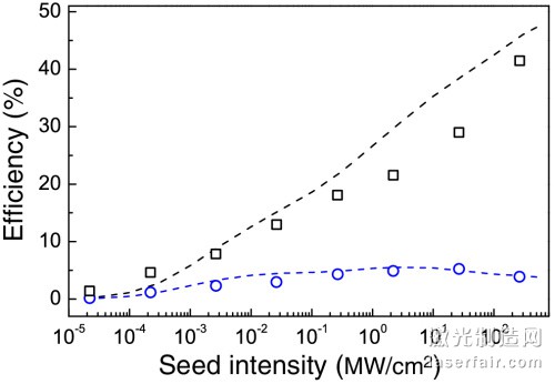 圖3. QPA過(guò)程中信號(hào)光(正方形)和閑頻光(圓形)轉(zhuǎn)換效率測(cè)試結(jié)果