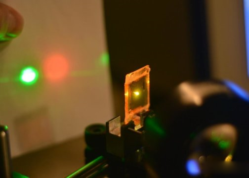 液晶彈性體在Peter Palffy-Muhoray博士的實(shí)驗(yàn)室里作為機(jī)械可調(diào)無(wú)腔鏡的“橡膠”激光使用。PeterPalffy-Muhoray博士是肯特州立大學(xué)(Kent State University)化學(xué)物理教授和Glenn H. Brown液晶研究所副主任。該彈性體具有當(dāng)其被拉伸的時(shí)候,能夠不使用腔鏡而精確發(fā)射激光的性能。