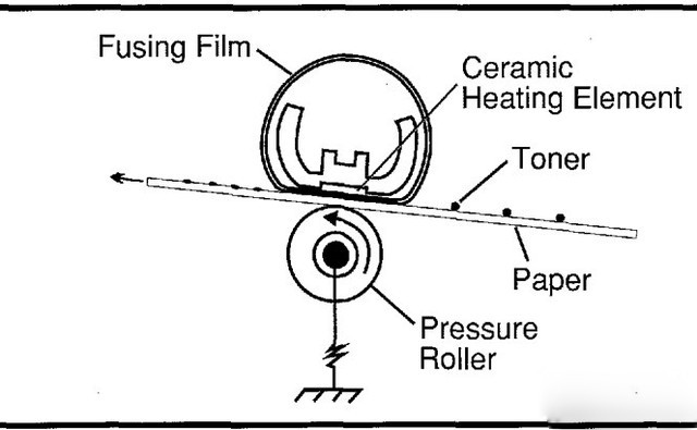 激光打印定影的原理圖:紙張載著碳粉,通過壓力輥和加熱的定影器,碳粉受熱升華后成像