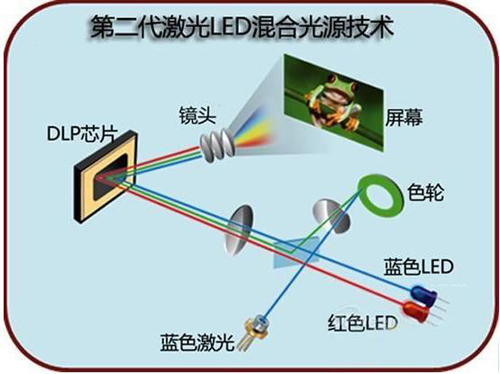 激光+LED混合光源技術(shù)是將紅(高亮度紅色LED)、綠(藍(lán)色激光通過熒光體轉(zhuǎn)換為綠色)、藍(lán)(藍(lán)色激光)三色,通過DLP芯片投影,即可以不使用高壓水銀燈泡而實(shí)現(xiàn)高亮度投影。激光+LED新光源集合這兩種光源壽命長、色域廣的特點(diǎn)于一身,在長時(shí)間內(nèi)亮度衰減不明顯,能較長時(shí)間保持鮮艷的影像品質(zhì),減少了維護(hù)成本和使用成本,現(xiàn)階段主要應(yīng)用在商務(wù)和教育領(lǐng)域。就現(xiàn)階段而言,三基色純激光、熒光粉+藍(lán)光、LED+激光三項(xiàng)激光顯示技術(shù)將會(huì)共存一段時(shí)間。