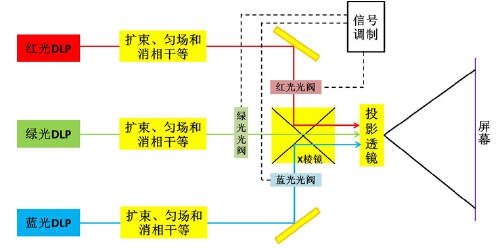 從技術(shù)上來看,激光電視是由激光發(fā)射器、調(diào)制器、偏轉(zhuǎn)器和屏幕組合成的顯示系統(tǒng)。當系統(tǒng)接收到視頻信號后,分離成三色(紅、藍、綠)的圖像信號,再經(jīng)過處理分別控制三色半導(dǎo)體激光器發(fā)射出相應(yīng)強度的激光,并經(jīng)過調(diào)制輸出和信號同步控制后,通過投影透鏡的光束掃描到屏幕上形成圖像。