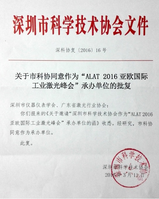 深圳市科協(xié)同意承辦2016亞歐工業(yè)激光峰會(huì)