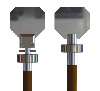 傳統(tǒng)的振鏡具有一個(gè)直徑比磁鐵小得多的輸出軸。制造商常常在這個(gè)非常小的軸上鉆一個(gè)孔,在其中放置一個(gè)“停止銷”(stoppingpin)來限制電機(jī)的旋轉(zhuǎn)量。不幸的是,這意味著,這個(gè)軸必須做得更長(zhǎng)以容納停止銷,這個(gè)用來容納停止銷的孔會(huì)削弱軸的強(qiáng)度。然后一個(gè)獨(dú)立的鏡座被用來作為軸和鏡子之間的界面,從而增加了磁鐵和鏡子之間的距離。