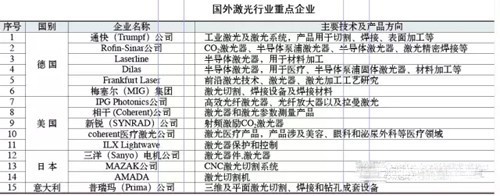 以德國(guó)、美國(guó)、日本、俄羅斯為代表的少數(shù)發(fā)達(dá)國(guó)家,目前主導(dǎo)和控制著全球激光技術(shù)和產(chǎn)業(yè)的發(fā)展方向(見(jiàn)附表)。其中,德國(guó)Trumpf、Rofin-Sinar公司在高功率工業(yè)激光器上稱(chēng)雄天下;美國(guó)IPG公司的光纖激光器引領(lǐng)世界激光產(chǎn)業(yè)發(fā)展方向。歐美主要國(guó)家在大型制造產(chǎn)業(yè),如機(jī)械、汽車(chē)、航空、造船、電子等行業(yè)中,基本完成了用激光加工工藝對(duì)傳統(tǒng)工藝的更新?lián)Q代,進(jìn)入“光加工”時(shí)代。