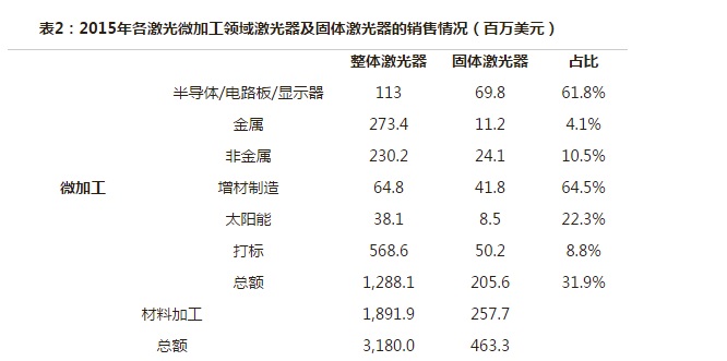 從表2中可知,在半導(dǎo)體/電路板/顯示器微加工和增材領(lǐng)域?qū)腆w激光器有著很強的依賴,2015年固體激光器在這兩項微加工領(lǐng)域占比都超過60%,表現(xiàn)最為突出。