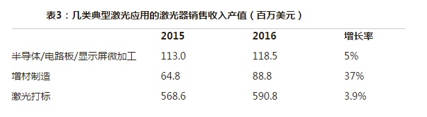 表3:幾類典型激光應(yīng)用的激光器銷售收入產(chǎn)值(百萬美元)