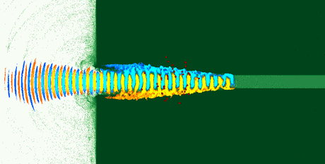 瑞菲夫和其研究同時(shí)開(kāi)啟德克薩斯拍瓦激光器,這是一個(gè)在這個(gè)世界上最強(qiáng)大的激光器。他們將目標(biāo)鎖定在一塊堅(jiān)實(shí)的塑料體上,這個(gè)塑料體與一個(gè)小房間鉆通,后者充滿了塑料泡沫。模擬是在一個(gè)超級(jí)計(jì)算機(jī)上進(jìn)行,即德克薩斯高級(jí)計(jì)算中心(TACC),模擬結(jié)果表明,激光穿過(guò)靶室而沒(méi)有產(chǎn)生一個(gè)洞,就像陽(yáng)光透過(guò)玻璃。一路上它激發(fā)了泡沫中的電子。這種高能電子粒子的等離子體,然后釋放一個(gè)受控制的超高能光子束,即γ射線