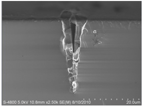 表面燒蝕切割是較為普遍的激光切割工藝,其原理是將激光聚焦于所需材料的表面,聚焦的地方吸收激光能量后形成去除性的融化和蒸發(fā),在切割表面形成一定深度的“V”型口,然后通過外部施加壓力使芯片分開,在半導(dǎo)體行業(yè)中由于其加工精度要求高,對表面效果要求也高,多采用短脈沖激光或超短脈沖激光。短脈沖激光器切割完后的“V”型槽效果如圖3所示: