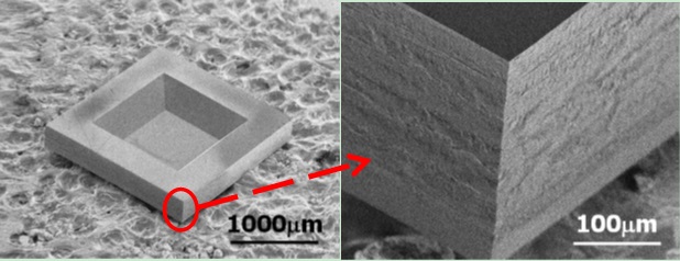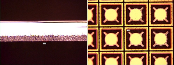 目前激光隱形切割技術(shù)廣泛應(yīng)用于LED芯片、MEMS芯片、FRID芯片、SIM芯片、存儲芯片等諸多晶圓的切割,如圖2以硅襯底MEMS晶圓為例,可以看到隱形切割的芯片幾乎沒有崩邊,芯片沒有機械損傷。