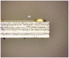激光隱形切割是一種全新的激光切割工藝,具有切割速度快、切割不產(chǎn)生粉塵、無切割基材耗損、所需切割道小、完全干制程等諸多優(yōu)勢。激光隱形切割最早起源于激光內(nèi)雕,其原理是將短脈沖激光光束透過材料表面聚焦在材料中間,由于短脈沖激光瞬時能量極高,在材料中間形成小的變質(zhì)點。將激光在聚焦在物質(zhì)內(nèi)部應(yīng)用到切割領(lǐng)域,由日本的光學(xué)知名企業(yè)濱松光學(xué)率先發(fā)明了隱形切割(steal dicing),多年來濱松一直持有這項技術(shù)的多項專利。幾年前德龍激光通過核心技術(shù)團隊技術(shù)攻關(guān),成功研發(fā)出了區(qū)別于濱松光學(xué)的隱形切割技術(shù),并申請了自己的專利,并將該技術(shù)應(yīng)用于藍寶石、玻璃、硅、SiC等多種材料的切割。隱切切割主要原理是將短脈沖激光光束透過材料表面聚焦在材料中間,在材料中間形成改質(zhì)層,然后通過外部施加壓力使芯片分開。中間形成的改質(zhì)層如圖1所示: