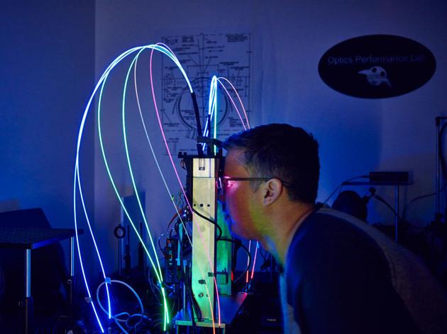 從今年4月《連線》雜志一張秘密訪問Magic Leap的照片可以看出,這家公司的AR眼鏡需要由光纖把多種顏色激光器發(fā)出的光導(dǎo)入到鏡片中,看起來相當(dāng)酷炫。