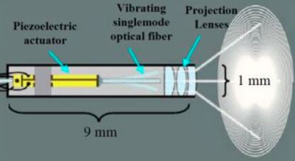光纖頭掃出的圖像雖然很小,但是通過掃描光纖前部的放大鏡片組,就能產(chǎn)生比光纖孔徑大得多的圖像。如下圖所示。
