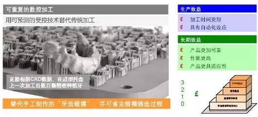 增材制造是一種高度自動(dòng)化的過(guò)程,在裝填好粉倉(cāng)并啟動(dòng)激光之后,整個(gè)加工過(guò)程便無(wú)需任何人工干預(yù)。因此,它可替代傳統(tǒng)的加工流程,提高生產(chǎn)成本效益,而加工結(jié)果的精度和可預(yù)測(cè)性也更好。增材制造在口腔領(lǐng)域的應(yīng)用就是很好的例子,手工制作的模型被采用數(shù)字化設(shè)計(jì)并自動(dòng)加工出的植入體替代。這是增材制造的內(nèi)在特性,在階梯的所有階段都能獲得這些效益。
