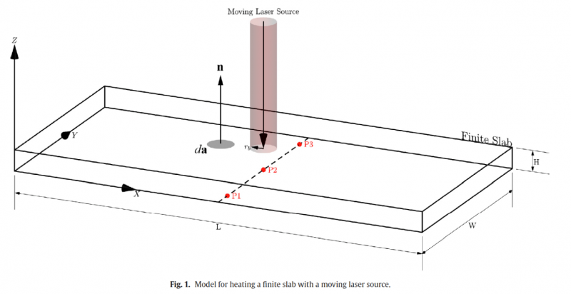 對(duì)于激光作用于金屬薄板的溫度場(chǎng)模型(圖1),目前主要研究方法包括解析方法、數(shù)值方法以及人工智能方法。其中數(shù)值方法和人工智能方法可以較準(zhǔn)確地模擬復(fù)雜工況,但一般來(lái)說(shuō)耗時(shí)較大。對(duì)于人工智能方法還需要建立大量的訓(xùn)練樣本。相對(duì)的,解析方法則可以在一定程度上快速預(yù)測(cè)溫度場(chǎng)。該研究工作考慮對(duì)流換熱邊界條件,通過(guò)直接求解有限大邊界的三維熱傳導(dǎo)方程,以求得溫度場(chǎng)隨時(shí)間的函數(shù)。首先通過(guò)分離變量法求解該模型所對(duì)應(yīng)的本征值問(wèn)題,得到一組完備的基函數(shù)(本征函數(shù))。然后將方程的非齊次項(xiàng)和溫度函數(shù)在該基函數(shù)上展開(kāi)為級(jí)數(shù)形式,系數(shù)待定。最后將該級(jí)數(shù)代入原方程,通過(guò)積分變換求得各項(xiàng)系數(shù),從而得到溫度場(chǎng)的解析解(圖2)。實(shí)際求解過(guò)程中,由于指數(shù)項(xiàng)的存在,該級(jí)數(shù)收斂較快,計(jì)算代價(jià)小。另外,可以通過(guò)采用低差異序列的準(zhǔn)蒙特卡洛方法處理任意激光掃描路徑下的溫度分布。因此,對(duì)于任意給定激光掃描路徑,均可通過(guò)該方程快速求得任意點(diǎn)在任意時(shí)刻的溫度。進(jìn)一步,該研究通過(guò)實(shí)驗(yàn)和有限元計(jì)算驗(yàn)證了該解的正確性。驗(yàn)證實(shí)驗(yàn)采用鋁合金AA6061T6板件為對(duì)象,YAG連續(xù)波激光系統(tǒng)為光源,并紀(jì)錄激光掃描過(guò)程中P1、P2、P3點(diǎn)(圖1)的溫度歷程。結(jié)果顯示,測(cè)量結(jié)果、有限元模型以及解析解在一定范圍內(nèi)是一致的。
