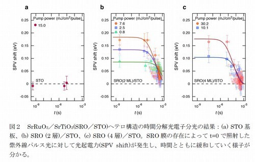 具體來說就是,SrRuO3的膜厚變化時,異質(zhì)界面的電子結(jié)構(gòu)會劇烈變化,其相應的光學響應會提高200倍等,且光電動勢的大小和緩和壽命會敏感地變動。