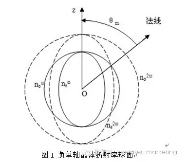 折射率面的定義:從球心引出的每一條矢徑到達面上某點的長度,表示晶體以此矢徑為波法線方向的光波的折射率大小。實現(xiàn)相位匹配條件的方法之一是尋找實面和虛面交點位置,從而得到通過此交點的矢徑與光軸的夾角。圖中看到,基頻光中o光的折射率可以和倍頻光中e光的折射率相等,所以當(dāng)光波沿著與光軸成θm角方向傳播時,即可實現(xiàn)相位匹配,θm叫做相位匹配角。