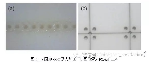 陶瓷在人類歷史中一直占據(jù)重要的角色,從日用品、裝飾用品到工業(yè)應(yīng)用,都可看到它的足跡。上個世紀(jì)電子陶瓷應(yīng)用逐漸成熟,應(yīng)用范圍更廣,例如散熱基板、壓 電材料、電阻、半導(dǎo)體應(yīng)用、生物應(yīng)用等,除了傳統(tǒng)的陶瓷加工工藝外,陶瓷加工也因應(yīng)用種類的增加,進而進入了激光加工領(lǐng)域。按照陶瓷的材料種類可分為功能 陶瓷、結(jié)構(gòu)陶瓷及生物陶瓷??捎糜诩庸ぬ沾傻募す庥蠧O2激光、YAG激光、綠光激光等,但是隨著元器件逐漸小型化,以及YAG激光或光纖激光加工已經(jīng)無法滿足其要求,因此紫外激光加工成為必要的加工方式,他可對多類陶瓷進行加工。CO2激光加工與紫外激光 加工的陶瓷切割效果對比圖如下: