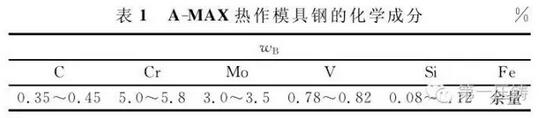 研究對(duì)象為有裂紋的發(fā)動(dòng)機(jī)缸體壓鑄模具。模具材質(zhì)為 A-MAX鋼,采用真空電渣重熔工藝精煉,淬透性好,使用壽命為SKD61鋼的3-5倍,裂紋深度比SKD61鋼淺40%。該鋼具有優(yōu)異的抗龜裂性能、高溫韌性、高溫強(qiáng)度、耐火性能和耐高溫強(qiáng)度的性能,用于各類大型、復(fù)雜的壓鑄模具。模具幾何尺寸為200mm×120mm×10mm ,化學(xué)成分見表1。