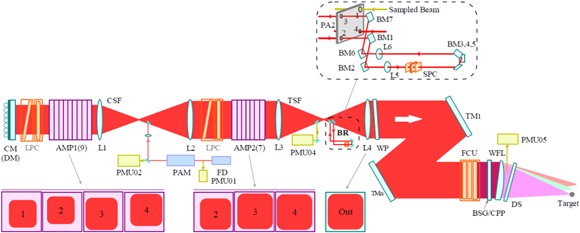 神光-III激光裝置由前端、預(yù)放大、主放大、靶場、光束控制與參數(shù)測量、計算機(jī)集中控制六大系統(tǒng)組成。納焦級的基頻單脈沖(波長為1053 nm)首先在前端系統(tǒng)產(chǎn)生,經(jīng)預(yù)放系統(tǒng)放大到焦耳量級,同時進(jìn)行光束的空間整形。激光脈沖進(jìn)入主放大系統(tǒng)后,進(jìn)一步被放大到約7.5 kJ/3 ns。而靶場系統(tǒng)則主要是實現(xiàn)全部48束激光的準(zhǔn)直引導(dǎo)、頻率轉(zhuǎn)換、諧波分離和精確聚焦,同時根據(jù)各類物理實驗的要求,實現(xiàn)靶的精確定位和靶面光強(qiáng)的精確控制,以滿足各類物理實驗的技術(shù)要求。光束控制與參數(shù)測量系統(tǒng)負(fù)責(zé)裝置運行期間光束的準(zhǔn)直和波前校正,并完成激光參數(shù)的測量。而集中控制系統(tǒng)則是實現(xiàn)了主機(jī)裝置各大系統(tǒng)之間的統(tǒng)籌控制和管理。