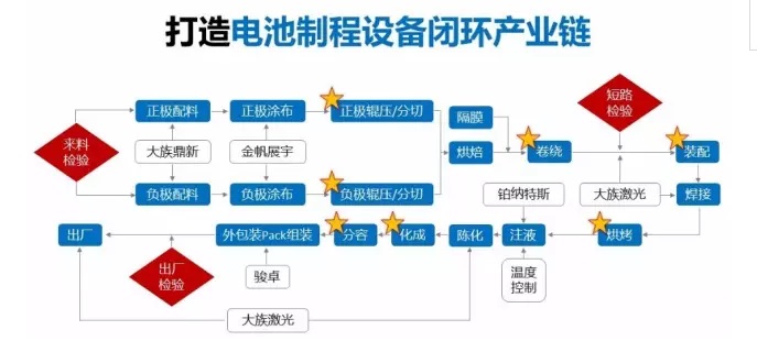 大族激光以鋰電激光焊接技術(shù)為基礎(chǔ),通過(guò)副總裁黃祥虎提出的“合縱連橫”戰(zhàn)略布局,以攻城略地之勢(shì),逐步打通新能源動(dòng)力電池制造制程設(shè)備閉環(huán)產(chǎn)業(yè)鏈,目前,已成功打通正負(fù)極配料、涂布環(huán)節(jié)、激光焊接、檢測(cè)、注液、外包裝pack組裝等電池制造產(chǎn)業(yè)鏈,而并購(gòu)金帆展宇是大族激光2017年全面完善新能源產(chǎn)業(yè)布局的重要環(huán)節(jié)之一。