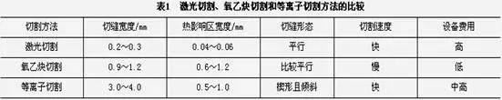 ③材料經(jīng)過(guò)激光切割后,熱影響區(qū)寬度很小,切縫附近材料的性能也幾乎不受影響,并且工件變形小,切割精度高,切縫的幾何形狀好,切縫橫截面形狀呈現(xiàn)較為規(guī)則的長(zhǎng)方形。激光切割、氧乙炔切割和等離子切割方法的比較見(jiàn)表1,切割材料為6.2mm厚的低碳鋼板。