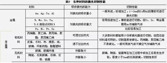金屬基復(fù)合材料、皮革、木材及纖維等。但是對(duì)于不同的材料,由于自身的熱物理性能及對(duì)激光的吸收率不同,表現(xiàn)出不同的激光切割適應(yīng)性。采用CO2激光器,各種材料的激光切割性能見(jiàn)表2。