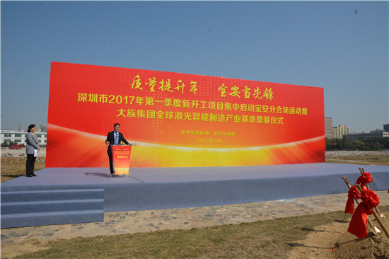 2017年2月15日,大族集團(tuán)全球激光智能制造產(chǎn)業(yè)基地奠基儀式在深圳市寶安區(qū)盛大舉行。寶安人民政府區(qū)長姚任,寶安區(qū)人大常委會主