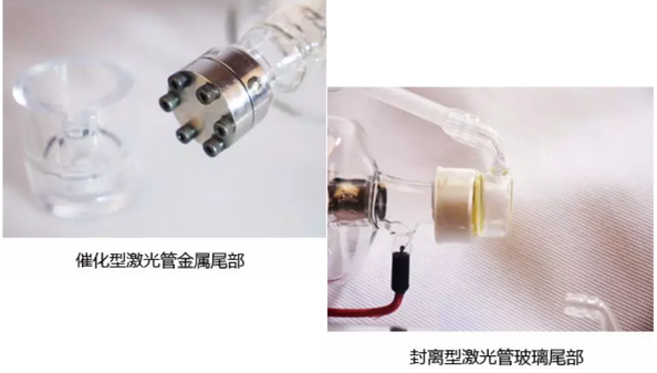 催化型和封離型激光管外型上的區(qū)別在于管子的尾部,催化型激光管尾部是金屬的,封離型激光管尾部是玻璃的。