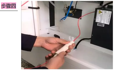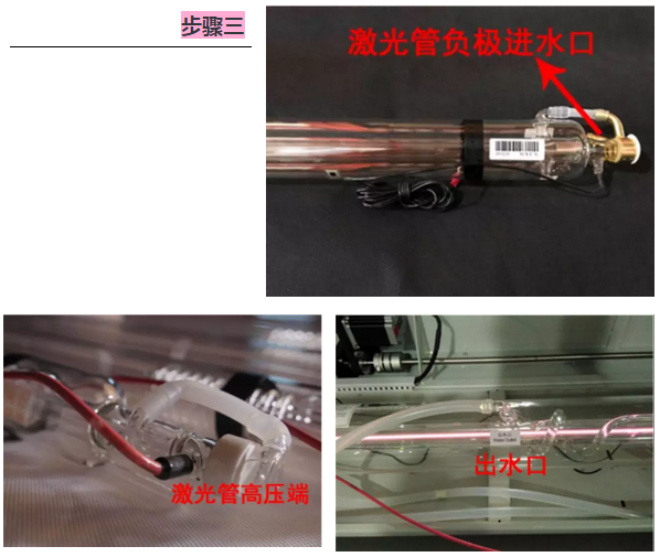 固定好激光管后,將連接水保護(hù)一端的進(jìn)水管與激光管負(fù)極端進(jìn)水口相連接,另一根出水管與激光管高壓端出水口連接好,如上圖所示。